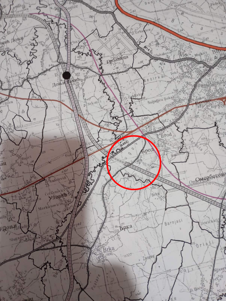 Karta jedne od verzija Trase Auto puta koja prolazi kroz Brčko distirkt BiH – Zemljište koje je prodato specijalnom pogodbom bivše Američke baze McGovern markirano crvenom bojom